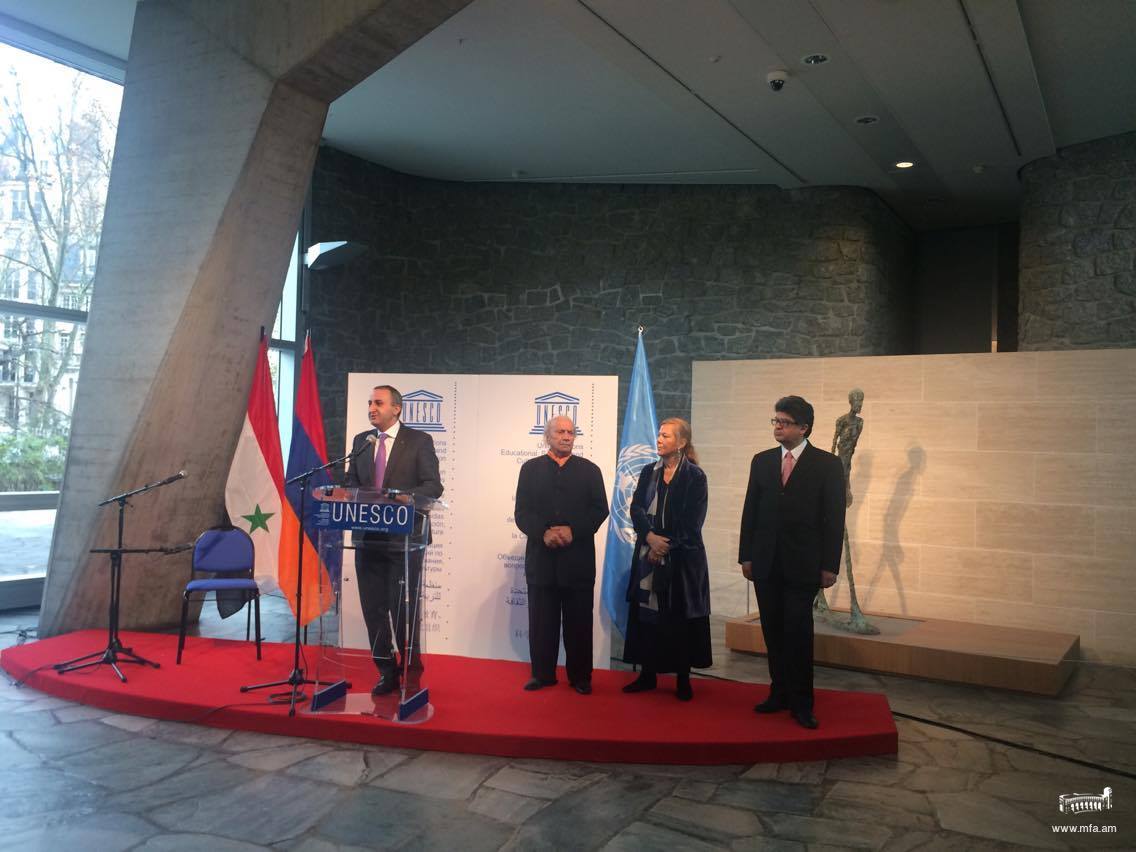 Lamya Shakur, Représentant permanent de la Syrie auprès de l'UNESCO, Levon Amirjanyan, Envoyé extraordinaire et Ministre plénipotentiaire de l'Ambassade de la République d’Arménie en France et Vahram Kazhoyan, Ambassadeur, Secrétaire général de la Commission nationale de l'UNESCO, ont prononcé des discours lors de la cérémonie d'inauguration.