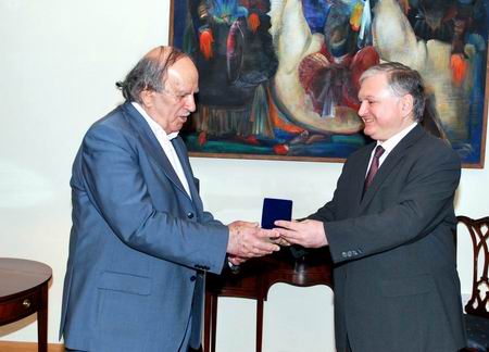 03 հունիսի, 2009Ս.թ. հունիսի 3-ին ՀՀ ԱԳ նախարար Էդվարդ Նալբանդյանն ընդունեց ԵՊՀ միջազգային հարաբերությունների ամբիոնի վարիչ, Միջազգային հարաբերությունների ֆակուլտետի հիմնադիր եւ բազմամյա դեկան, պատմական գիտությունների դոկտոր, պրոֆեսոր Էդիկ Զոհրաբյանին: Էդվարդ Նալբանդյանն Էդիկ Զոհրաբյանի 70-ամյակի կապակցությամբ նրան պարգեւատրեց ԱԳՆ հուշամեդալով: